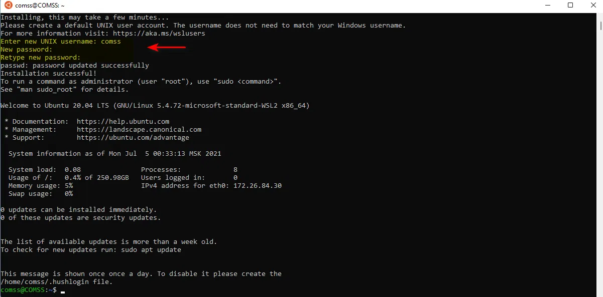 Для каждого установленного дистрибутива Linux в среду Windows создается уникальное имя пользователя и пароль. Уникальная учетная запись будет использоваться для входа в конкретный дистрибутив. Эта учетная запись обладает возможностью брать права администратора Linux.