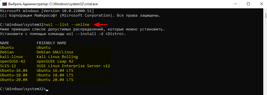 - Для получения списка доступных дистрибутивов Linux необходимо ввести следующую команду