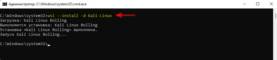 wsl. Будет запущен дистрибутив Linux по умолчанию. Если установлено несколько дистрибутивов, ввести, например командуwsl -d Kali-Linux