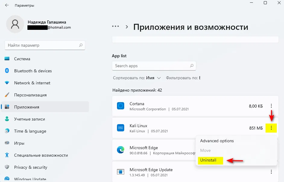 - Выбрать дистрибутив Linux, который необходимо удалить, нажать на пиктограмму справа и выбрать Uninstall