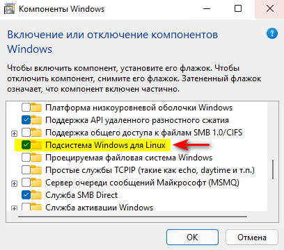 - При необходимости отключения компонента Подсистема Windows для Linux открыть окно Компоненты Windows, снять соответствующий флажок в чекбоксе и перезагрузить компьютер.