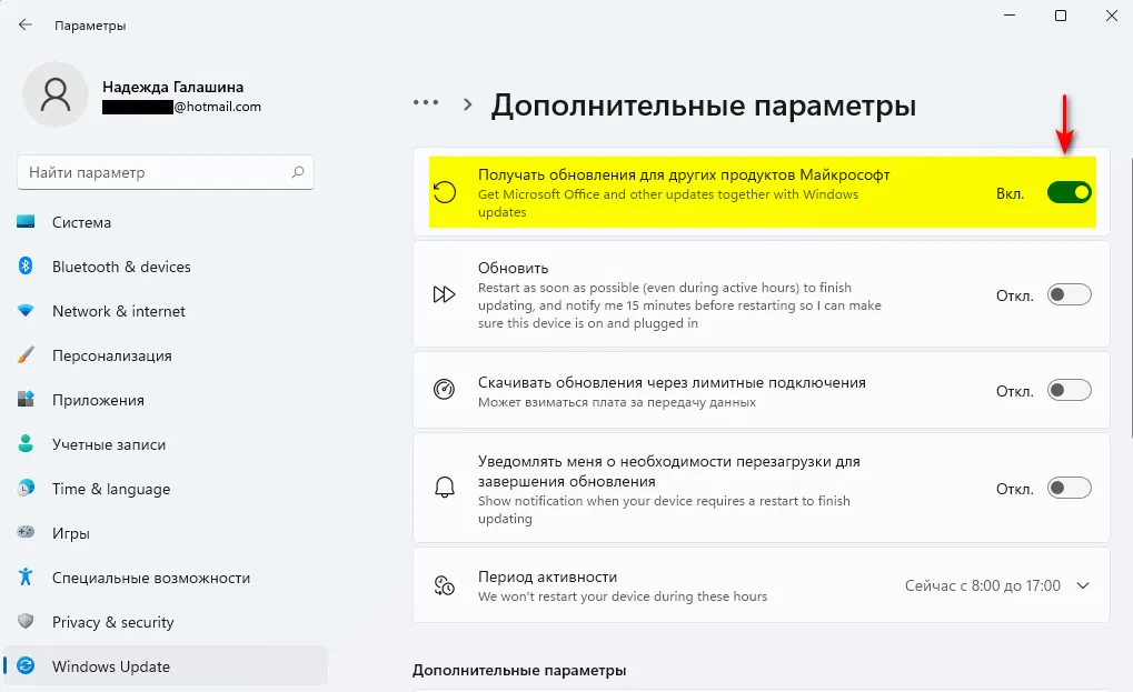 Рис.15 Включение параметра Получать обновления для других продуктов Microsoft при обновлении Windows