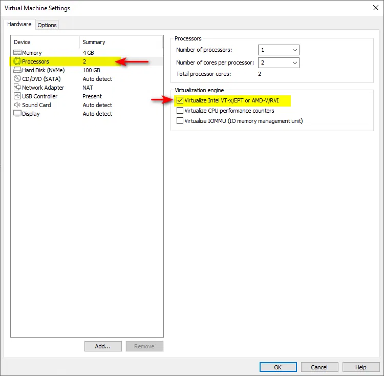 - в разделе Hardware выбрать Processors и установить флажок в чекбоксе Virtualize Intel VT-x/EPT or AMD-V/RVI