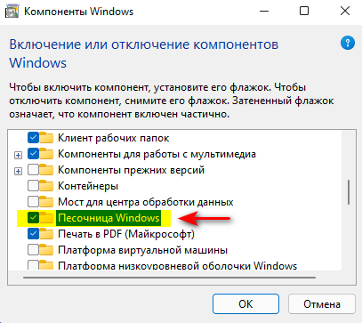 - Установить флажок в чекбоксе Песочница Windows, нажать ОК, по завершению установки перезагрузить компьютер.