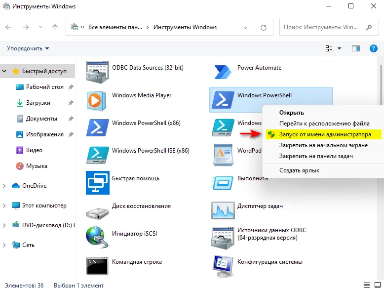 - Выбрать правой клавишей мыши PowerShell и в контекстном меню выбрать Запуск от имени администратора