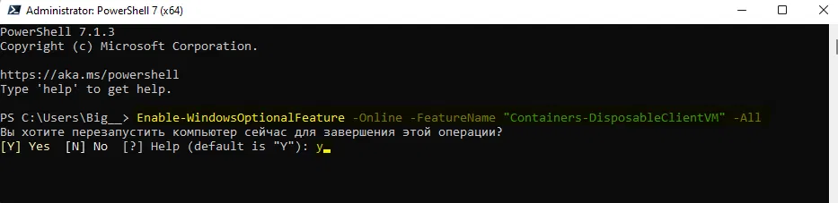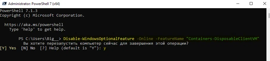 - По завершении операции перезагрузить компьютер, введя в окне PowerShell букву Y и нажать клавишу Enter.