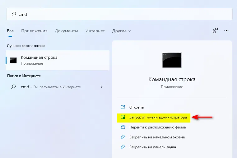 - Запустить командную строку от имени администратора: