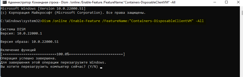 - Для включения компонента Песочница Windows ввести следующую команду и нажать Enter:
