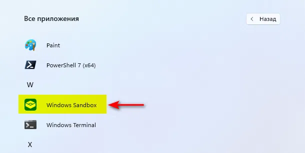 - Для запуска Песочницы Windows открыть меню Пуск > Все приложения и выбрать Windows Sandbox