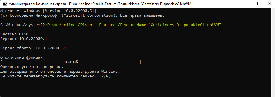Рис.12 Отключение компонента Песочница Windows с использованием командной строки