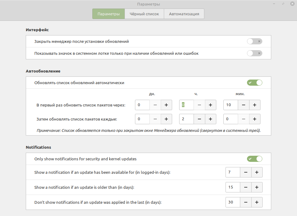Пользователь может настроить поведение отображения уведомлений. Параметры полного отключения уведомлений и изменения интервала, в течение которого уведомления отображаются или будут скрыты, можно настроить в настройках Менеджера обновлений.