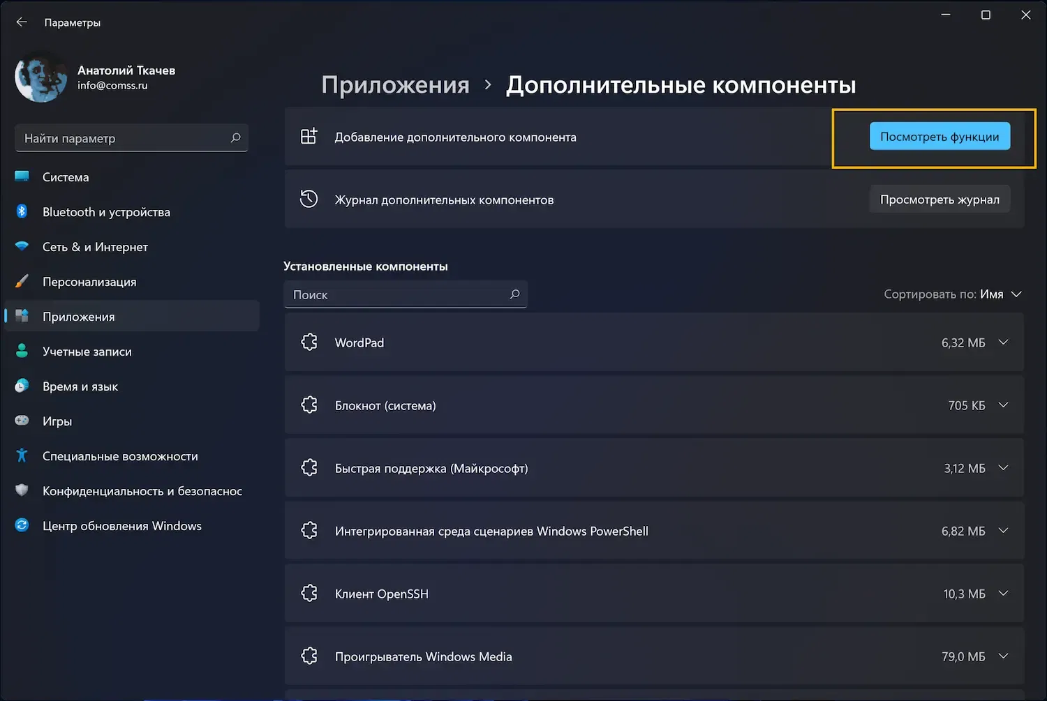 Чтобы начать работу, нажмите сочетание Win+I, которое откроет панель настроек Windows 11. Затем перейдите на вкладку Приложения и нажмите на раздел Дополнительные компоненты.