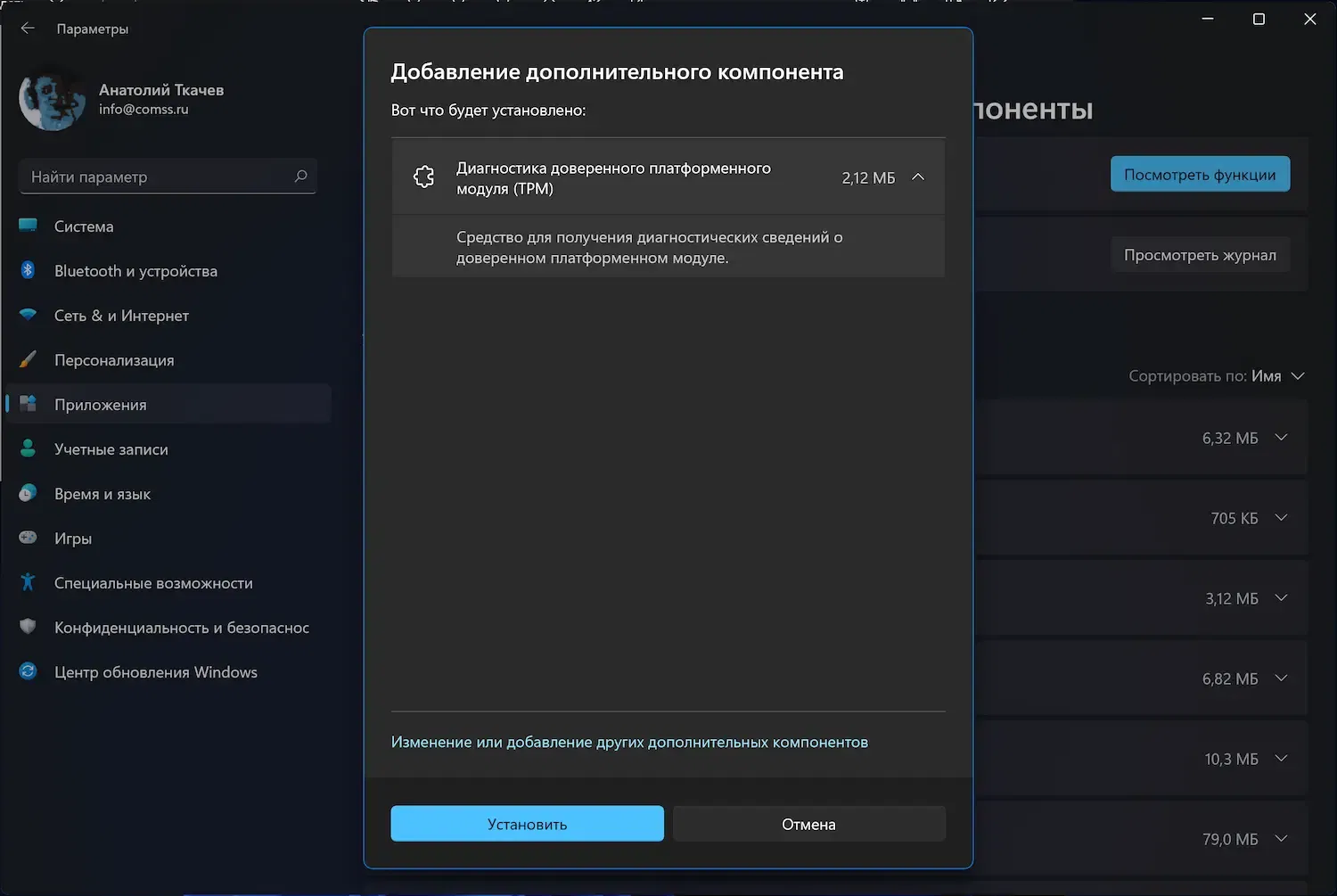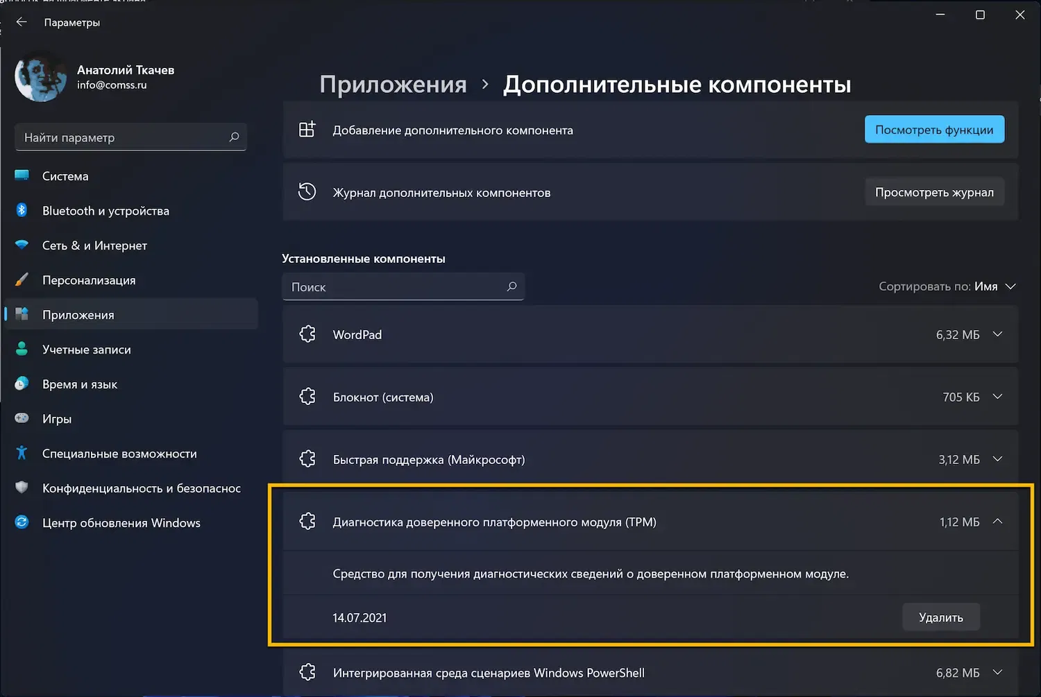 Сначала вы должны открыть приложение «Параметры», например нажав сочетание Win+I. Затем перейдите в Приложения > Дополнительные компоненты и найдите Диагностика доверенного платформенного модуля (TPM) в разделе Установленные компоненты.