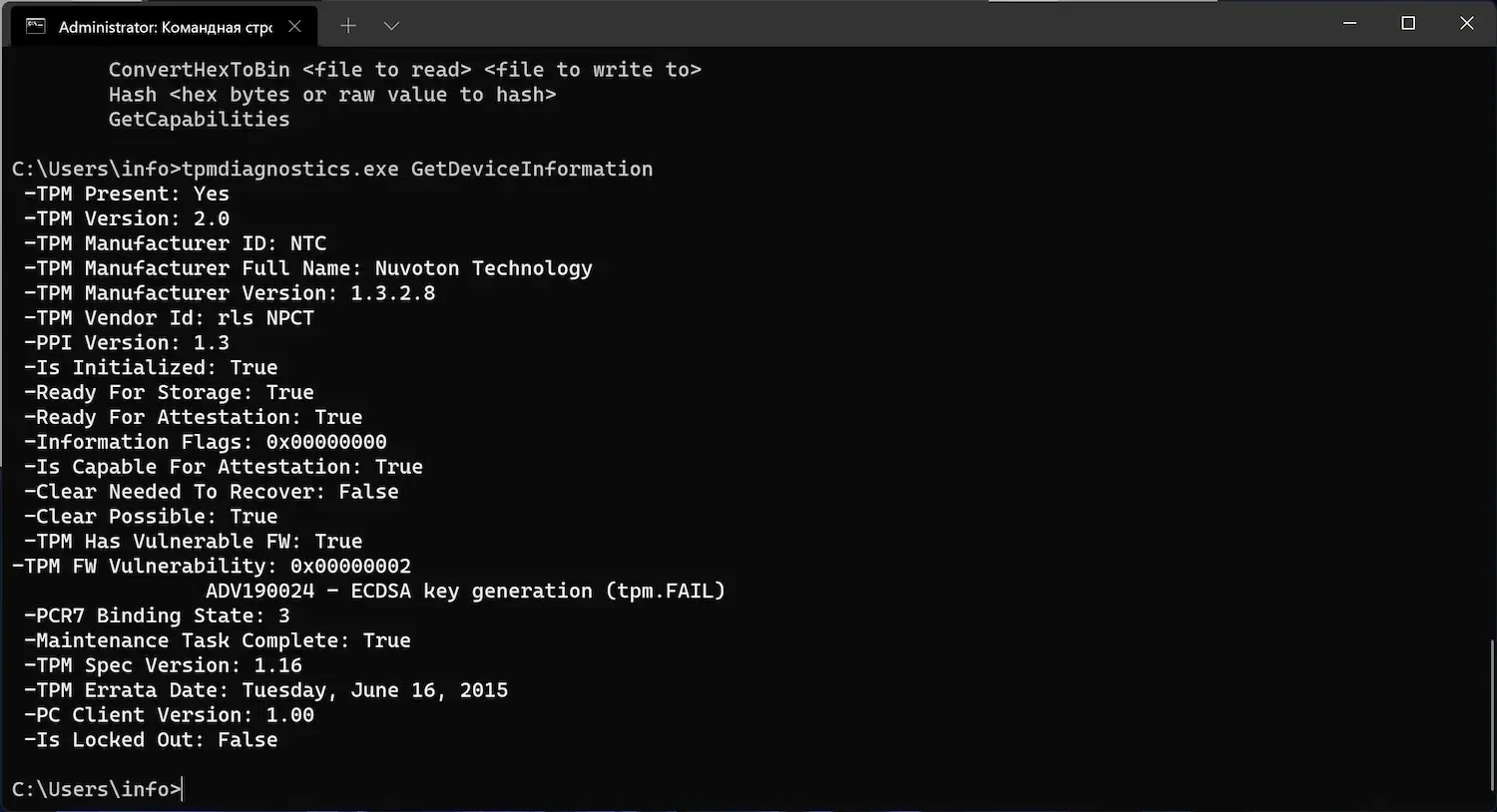Команда показывает доступность TPM, версию, идентификатор производителя и другие данные. Можно войти в любую другую команду, используя следующий щаблон: