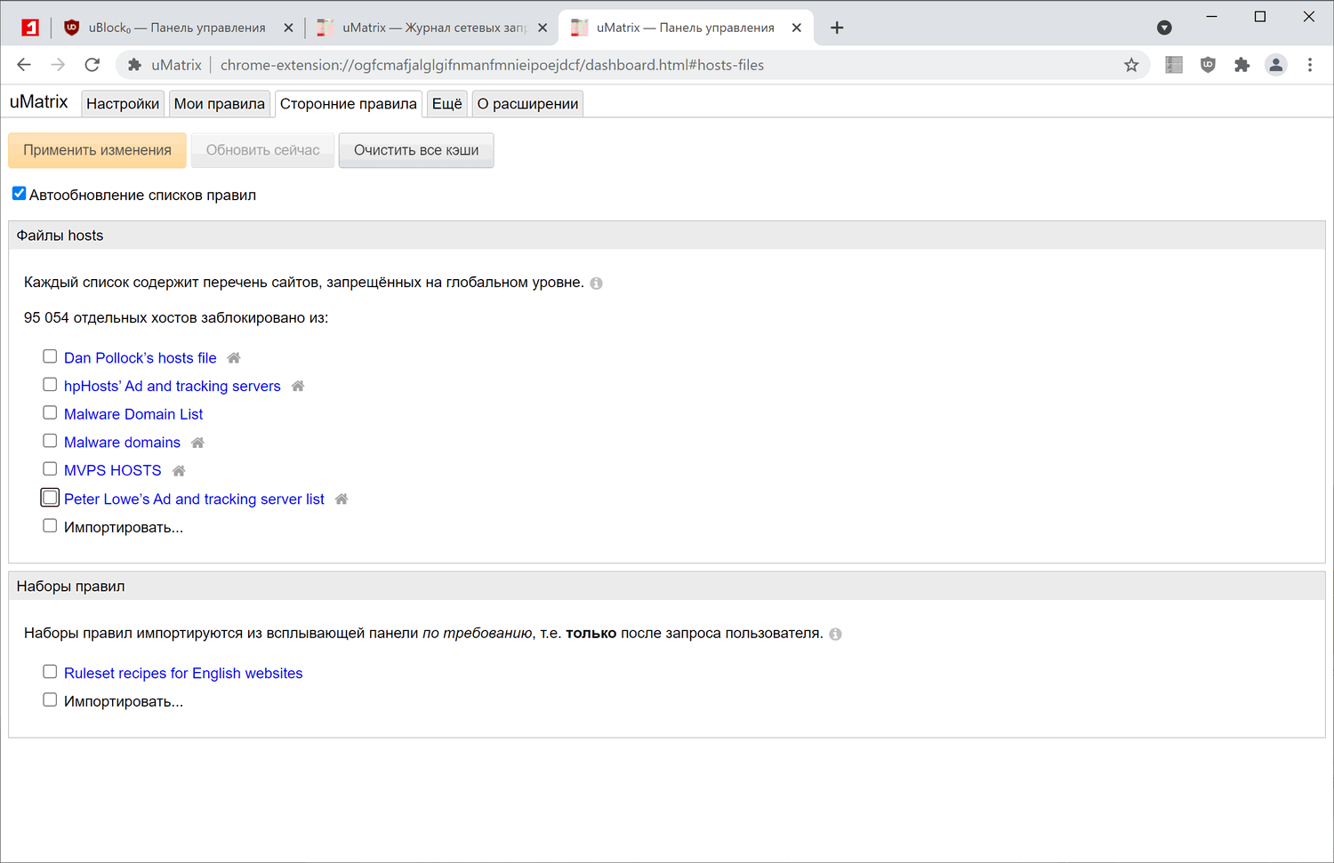 Исследователь отмечает, что пользователям необходимо отключить все списки фильтров на вкладке "Сторонние правила" (assets) на панели управления uMatrix. Подписка на списки фильтров против вредоносного ПО и многоцелевые списки в uBlock Origin поможет уменьшить влияние на снижение возможностей блокировки расширения uMatrix.