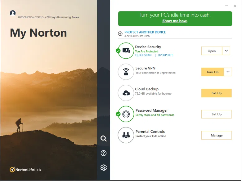 Вы можете майнить криптовалюту на любом компьютере, на котором установлен Norton 360 с активной подпиской, при условии, что компьютер соответствует минимальным системным требованиям. Максимальное количество компьютеров ограничено количеством устройств, включенных в ваш план подписки.