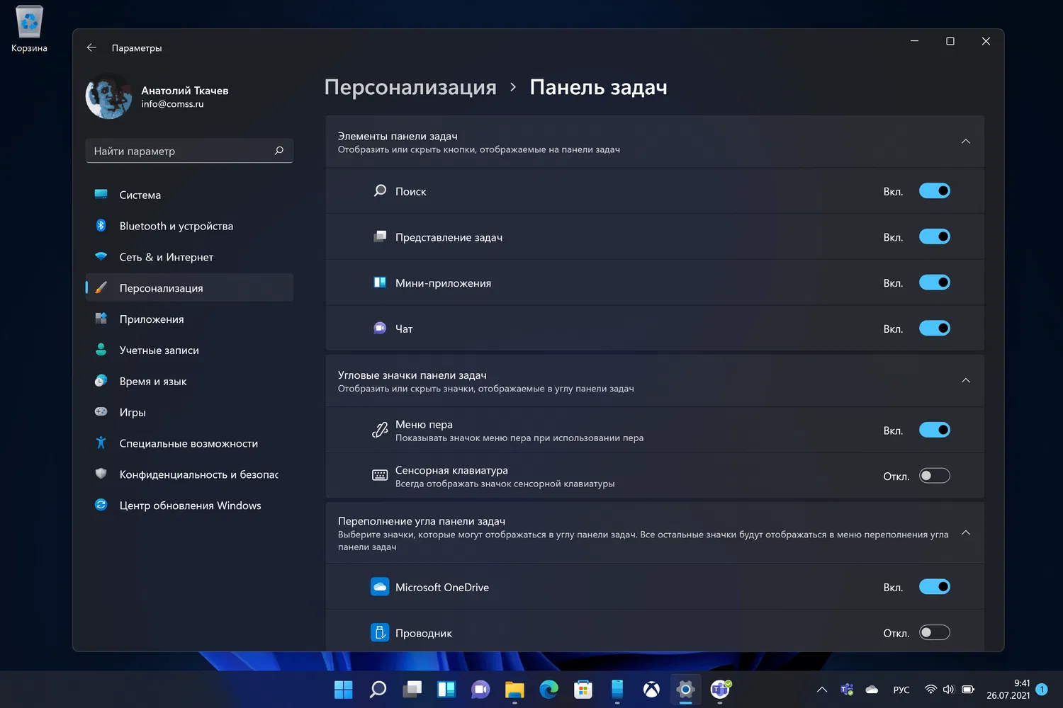 Первое, что бросается в глаза — вы больше не можете изменить положение панели задач по сторонам экрана. В Windows 11 панель задач может располагаться только снизу экрана, но не сбоку или сверху. Microsoft не комментировала это решение, но одно из возможных объяснений состоит в том, что другие позиции мешали новому центрированному положению меню «Пуск», а удаление этих опций стало наиболее простым и дешевым решением.