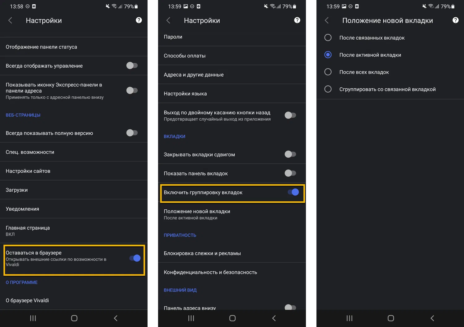 Vivaldi - один из немногих браузеров, мобильная версия которого может отображать панель вкладок. Новые параметры определяет, как будут открываться новые вкладки: