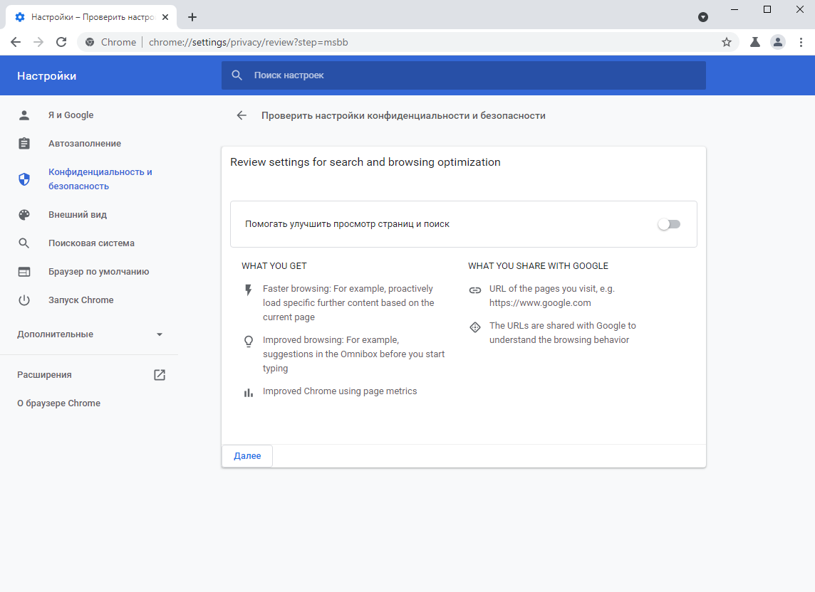 Проверка настроек конфиденциальности и безопасности Google Chrome 94