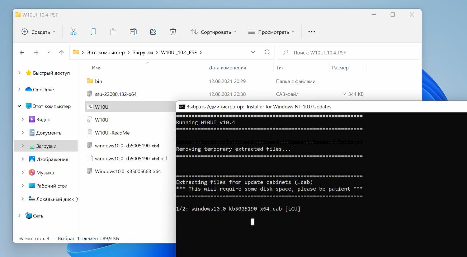 - Поместите в папку W10UI_10.4_PSF все три файла обновления (обновление SSU, обновление KB5005190 в виде CAB и PSF файлов) для выбранной платформы.