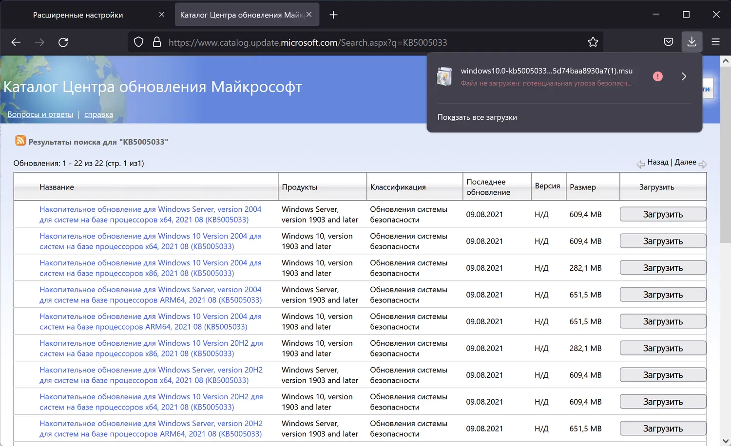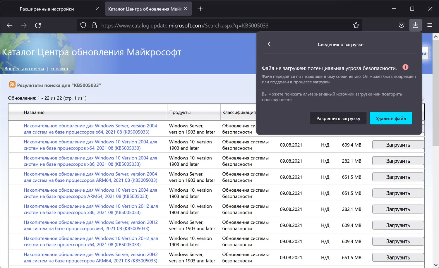В таких случаях Firefox не будет скачивать файл автоматически и отобразит предупреждение на панели загрузки «Файл не загружен. Потенциальная угроза безопасности».
