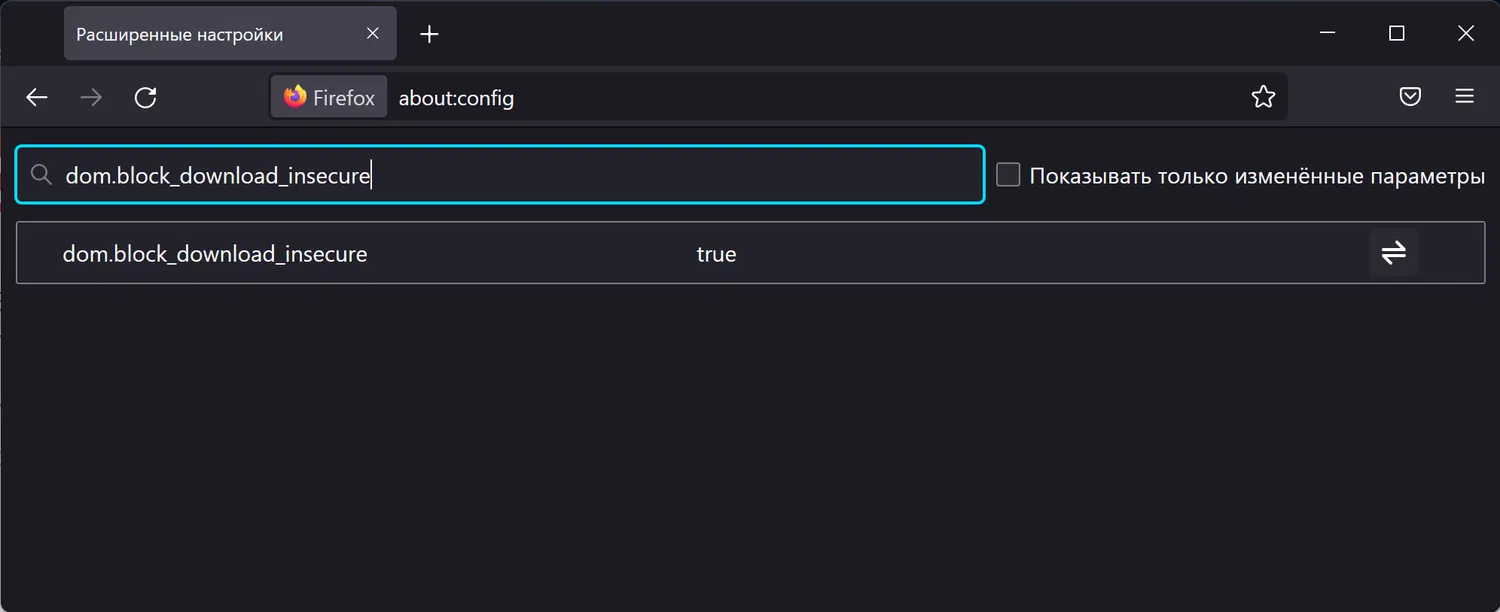 - С помощью строки поиска найдите параметр dom.block_download_insecure.