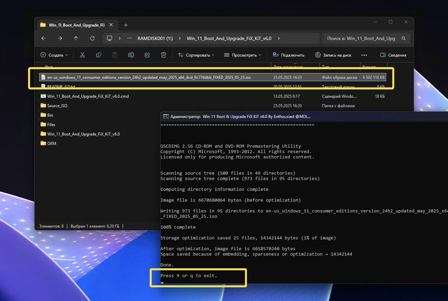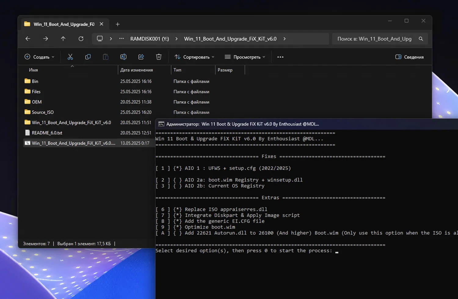 - Запустите скрипт Win_11_Boot_And_Upgrade_FiX_KiT_v6.0.cmd от имени администратора, выберите первый вариант создания образа (подробно о каждом из варианте, вы можете прочитать на нашем сайте) и нажмите 0 для запуска процесса сборки ISO-образа.