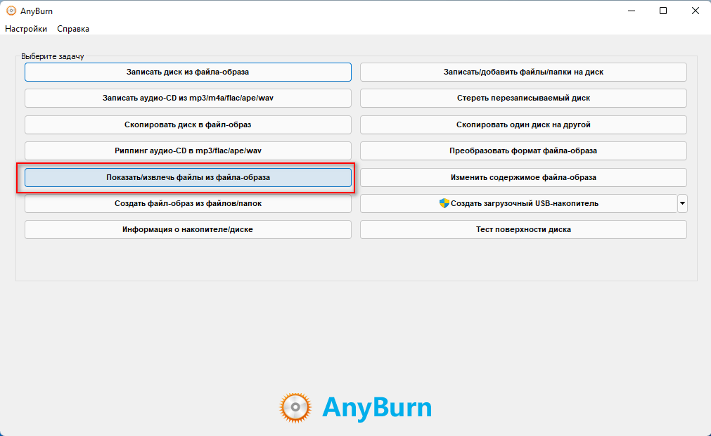 - Запустите программу AnyBurn и в ней выберите задачу Показать/извлечь файлы из файла-образа.