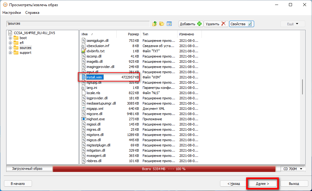 - В следующем окне перейдите в папку sources и в ней нажмите (выделите) на файл install.wim, затем нажмите на кнопку Далее.
