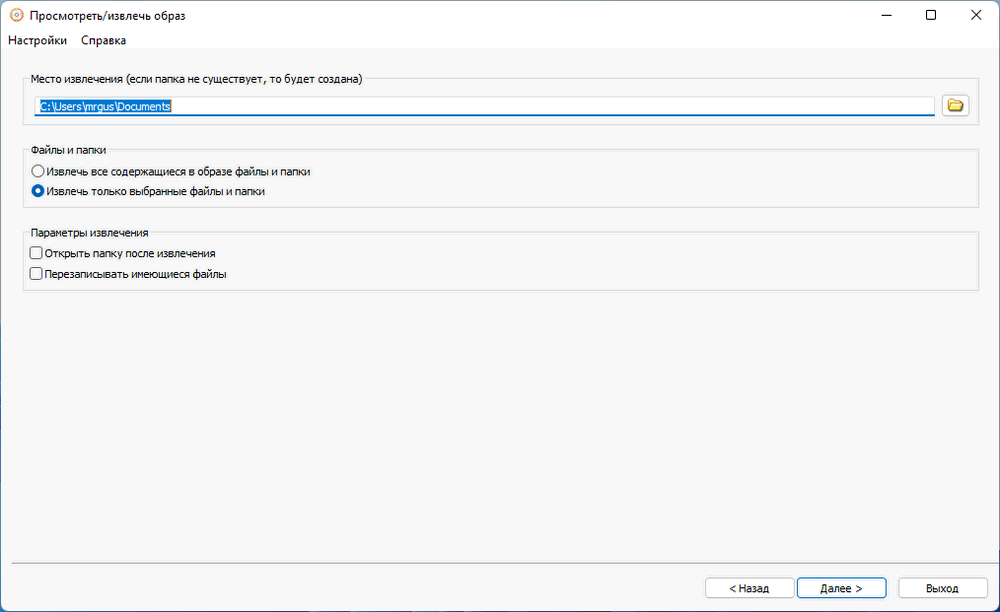 - В следующем окне вам нужно будет указать папку в которую будет извлечен выбранный файл install.wim, остальные настройки оставляем по умолчанию (извлекаем только выбранный файл). По окончанию извлечения файла нажмите на кнопку Выход.