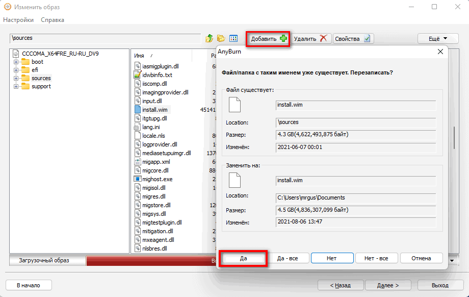 - Затем перейдите в папку sources и в окне программы AnyBurn нажмите на кнопку Добавить, либо же из Проводника перетяните файл в окно программы. Добавляем файл install.wim, который извлекли из образа Windows 11. Соглашаемся с заменой файла.