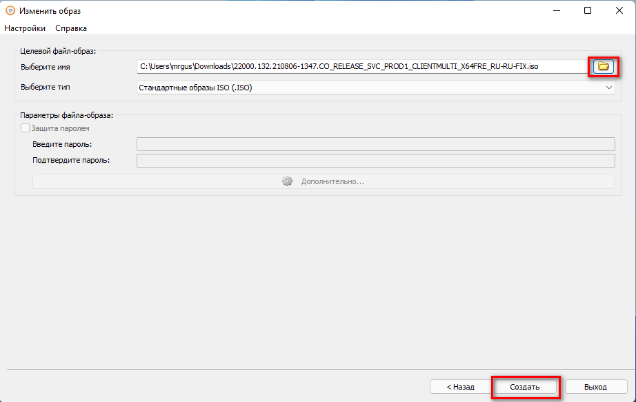 - В следующем окне не забываем указать расположение ISO-образа, который будет создан, также можно указать его новое название.
