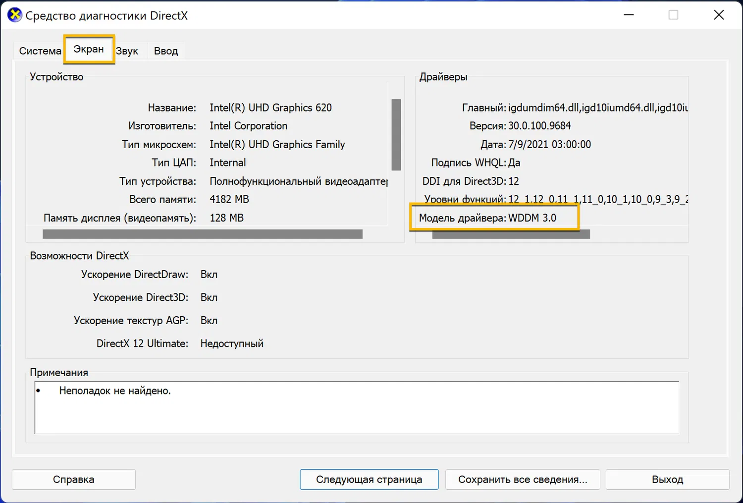 Перед активацией функции вам нужно убедиться, что устройство поддерживает Dynamic Refresh Rate и WDDM 3.0. Чтобы это проверить, перейдите в Средство диагностики DirectX (dxdiag), переключитесь на вкладку Экран и узнайте версию в поле Модель WDDM.