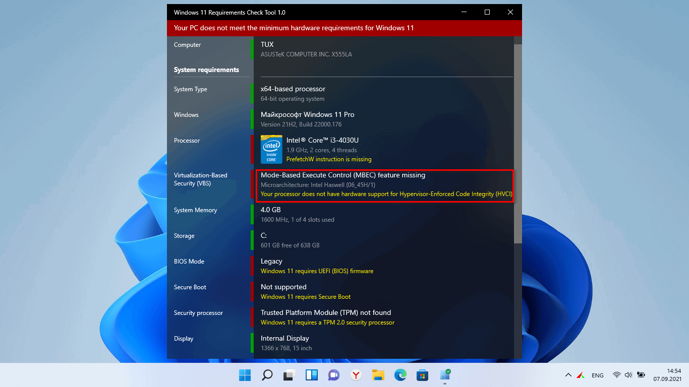 Многие задаются вопросом, почему процессоры Intel 6-го и 7-го поколения не подходят, а процессоры Intel 8-го поколения и выше отвечают аппаратным требованиям. Подобно AMD Zen 1 и AMD Zen 2. Windows 11 требует наличие функции безопасности (в дополнение к TPM 2.0), с которой могут справиться только текущие процессоры от Intel Kaby Lake или AMD Zen 2 и выше. В Intel этот компонент называется MBEC (Mode Based Execution Control) и является частью HVCI (целостность кода, защищенного гипервизором).