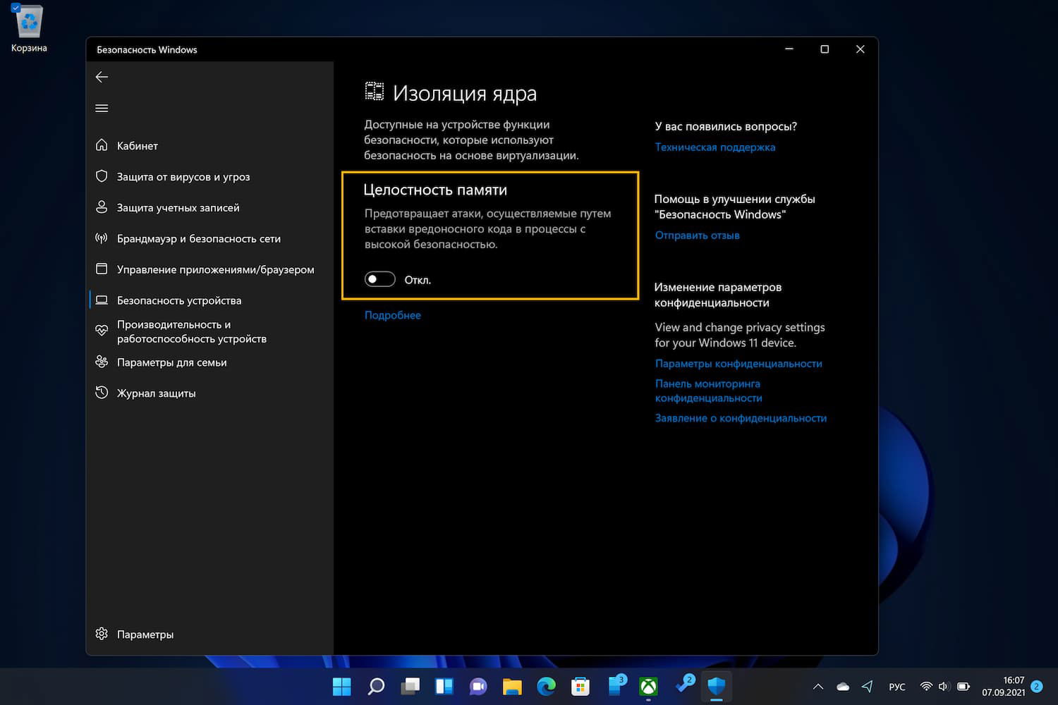 HVCI известен всем нам как защита целостности памяти (Изоляция ядра). Эту функцию можно активировать в разделе Безопасность Windows -> Безопасность устройства: