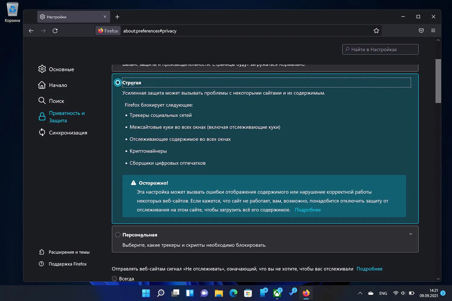 Прежде всего, Firefox — это быстрый и многофункциональный браузер с собственной экосистемой надстроек, расширений и параметров персонализации. В Firefox есть специальная функция «Улучшенная защита от отслеживания», которая блокирует рекламные трекеры и трекеры социальных сетей, межсайтовые отслеживающие куки, сборщиков цифровых отпечатков. По умолчанию Firefox будет делать это только в приватных окнах. Перейдите в Настройки > Приватность и Защита и переключитесь в режим защиты Строгая, чтобы защита применялась во всех окнах браузера. Предусмотрен также отдельный режим Персональная, который позволяет детально настраивать блокировку.