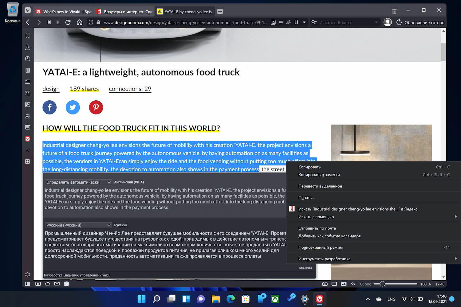 В Vivaldi 4.2 эта функциональность была улучшена: появилась поддержка функции перевода выделенного текста. Данная возможность будет полезна для быстрого перевода части страницы, но также и для веб-страниц, отображающих контент на нескольких языках. Кликните правой кнопкой мыши по выделенному фрагменту текста и выберите опцию контекстного меню «Перевести выделенное». После этого откроется всплывающее окно с исходным текстом и переводом.