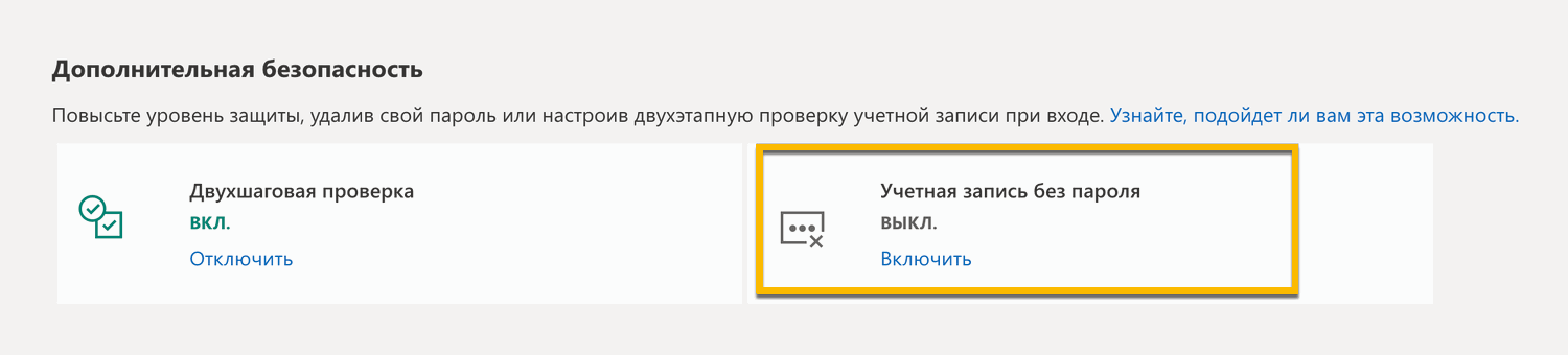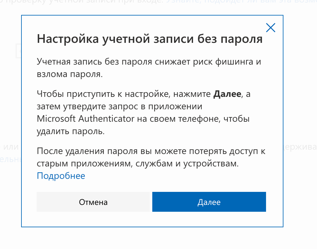 Отказаться от пароля довольно просто. Вам потребуется установить мобильное приложение Microsoft Authenticator и связать его с вашей личной учетной записью Microsoft. После этого вы можете посетить account.microsoft.com и выбрать Безопасность > Расширенные параметры безопасности, а затем включить учетные записи без пароля в в разделе Дополнительная безопасность. Затем вы подтверждаете изменение в своем приложении Authenticator, и у вас не будет пароля. Вы всегда можете отменить изменение и в будущем снова добавить пароль к своей учетной записи Microsoft.