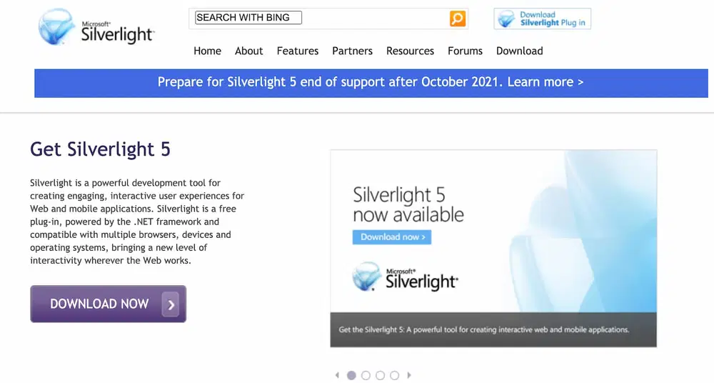 На официальной странице Silverlight на сайте Microsoft отображается баннер, напоминающий посетителям о предстоящем окончании поддержки.