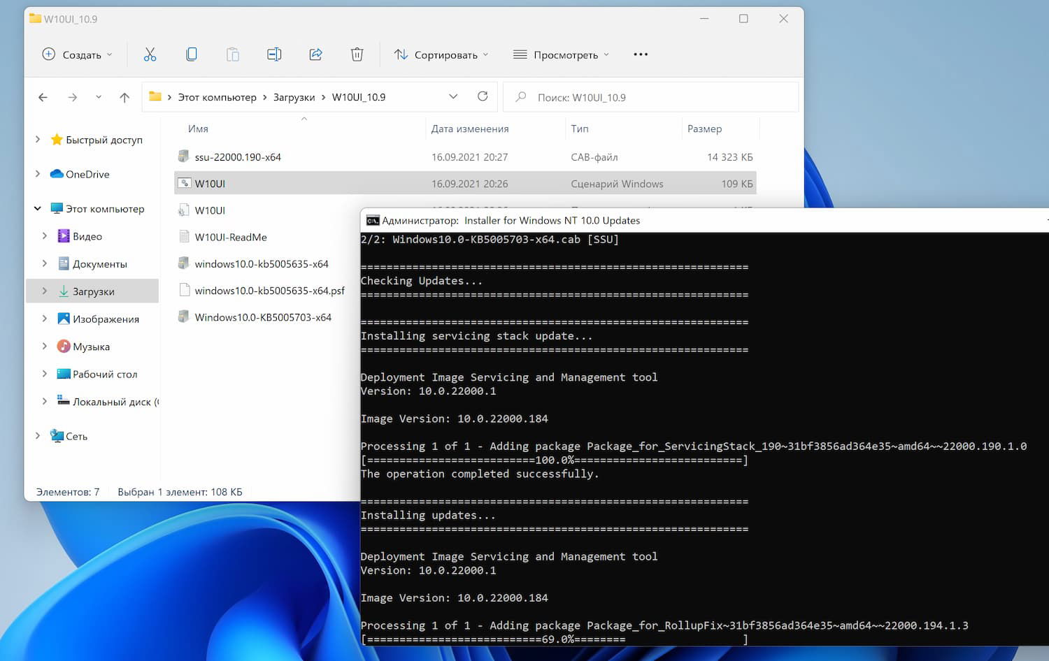 - Поместите в папку W10UI_10.9 все три файла обновления (обновление SSU, обновление KB5005635 в виде CAB и PSF файлов) для выбранной платформы.