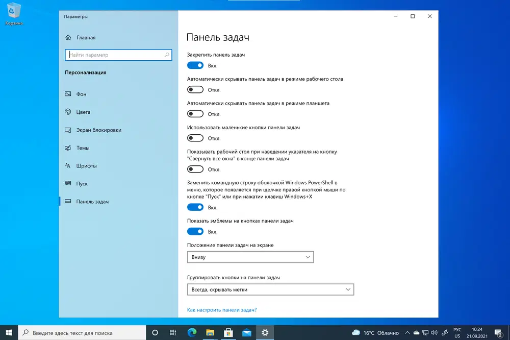 Microsoft предлагает множество параметров персонализации для панели задач в Windows 10. Вы можете закрепить панель задач, автоматически скрывать панель задач в режиме планшета, изменить расположение панели, отключить определенные значки, объединять кнопки на панели задач и разделять настройки панели для различных дисплеев. Одним словом, вы можете очень гибко настроить панель задач под ваш сценарий использований.