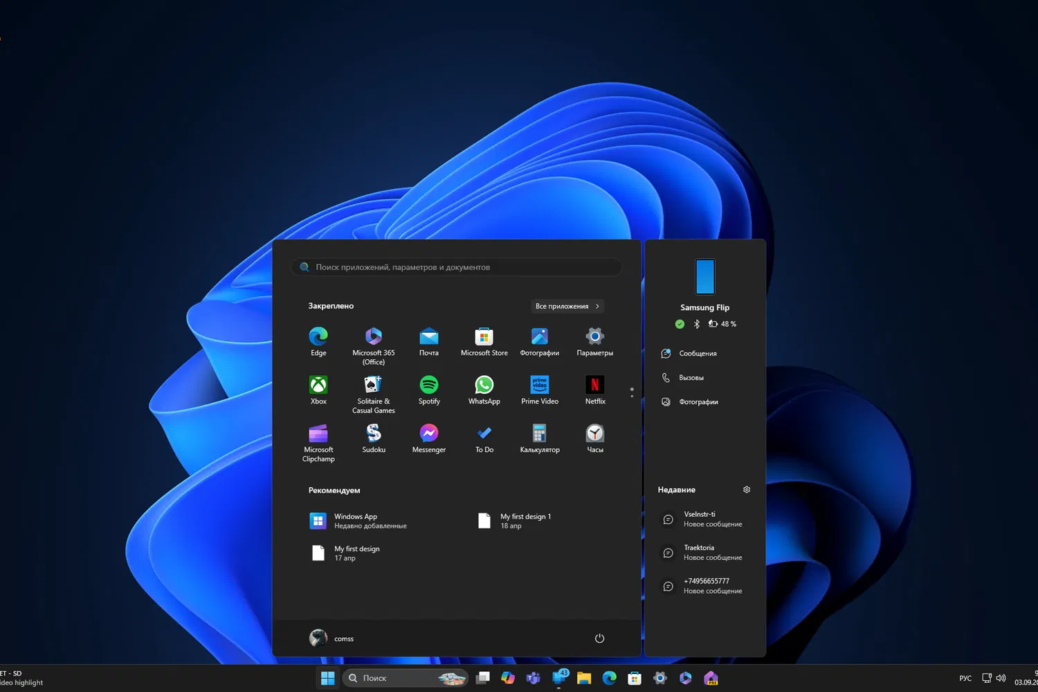 - В меню «Пуск» добавлена боковая панель для программы «Связь с телефоном», отображающая заряд батареи телефона, уведомления и доступ к сообщениям.