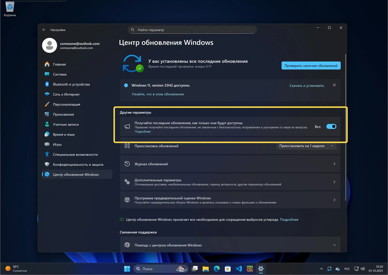 Для получения обновления перейдите в меню Параметры > Центр обновления Windows" включите опцию "Получайте последние обновления, как только они будут доступны" и выберите "Проверить наличие обновлений".