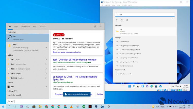 Для целей тестирования была создана папка с названием «Test». При запуске поискового запроса «Test» Windows 10 отдала предпочтение результатам поиска Bing для тестов на COVID-19 и тестов скорости Интернета, в то время как Windows 11 быстро предложила правильный каталог. Даже повторные результаты поиска показывают, что веб-результаты имеют гораздо более низкий приоритет в конфигурации Windows 11. Очевидно, что Microsoft значительно обновила свою реализацию поиска Windows и поработала над улучшением производительности.