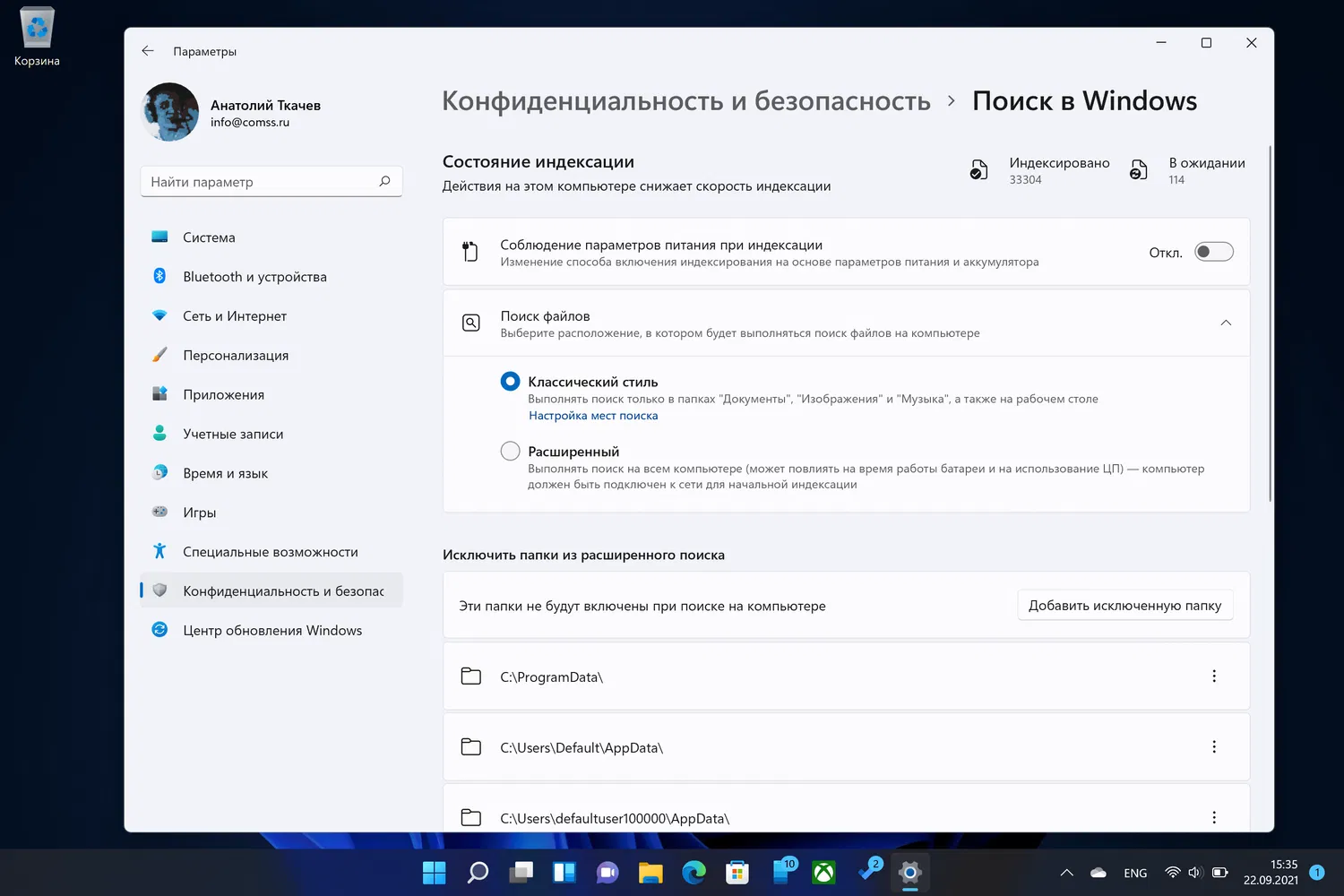 Сами настройки практически не отличаются от тех, которые доступны в Windows 10. Вам доступны обычные параметры индексации, список исключений папок, две опции для выбора расположений, в которых будет выполняться поиск и некоторая дополнительная информация, связанная с индексацией. Microsoft лишь изменила порядок отображения этих настроек и немного скорректировала формулировку.