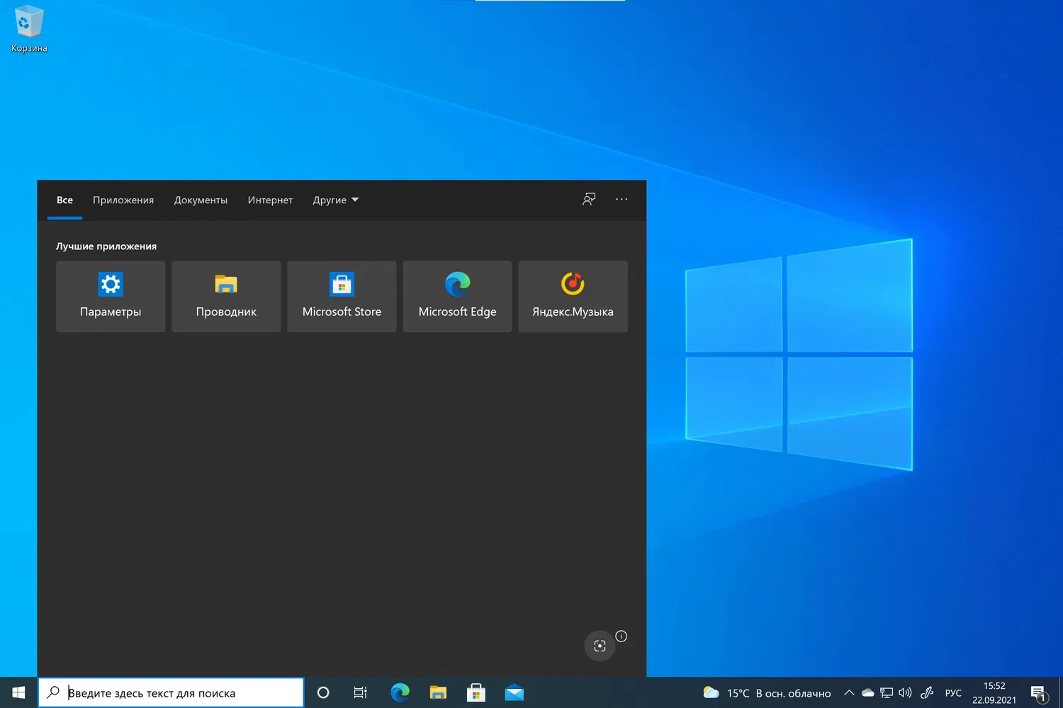 Параметры, доступные в верхней части пользовательского интерфейса поиска также особо изменились. Пользователям доступны привычные опции: Все, Приложения, Документ, Интернет и Другие. Также отображается значок Отправить отзыв и меню «три точки», знакомое пользователям Windows 10.