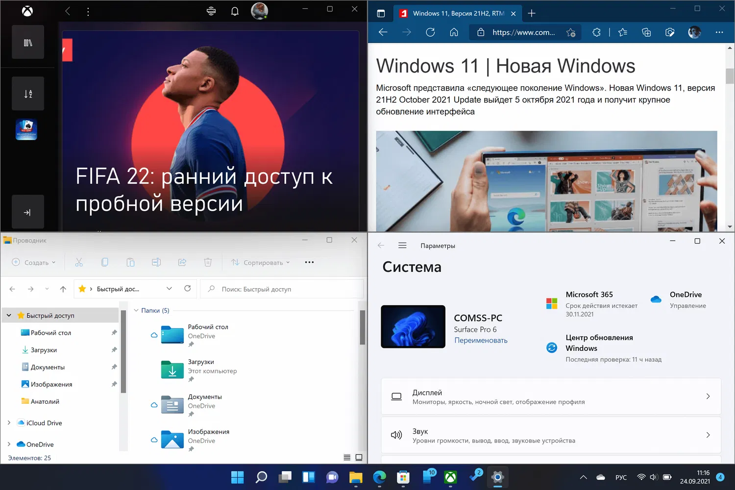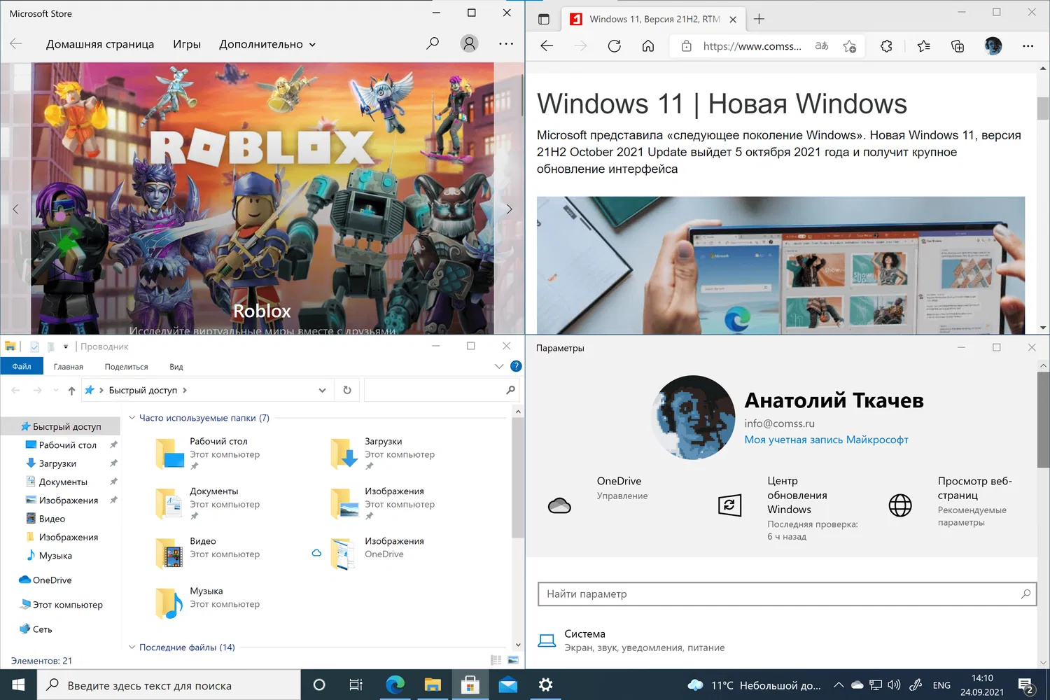 Как обычно, прежде чем перейти к функциям прикрепления окон в Windows 11, освежим в памяти то, что мы имеем в предшественнике в лице Windows 10. В Windows 10 также доступны функции привязки, позволяющие разместить на экране до 4 окон одновременно. Прикреплять окна можно за счет их перетаскивания в угол экрана или используя комбинацию клавиши Windows и клавиш стрелок.