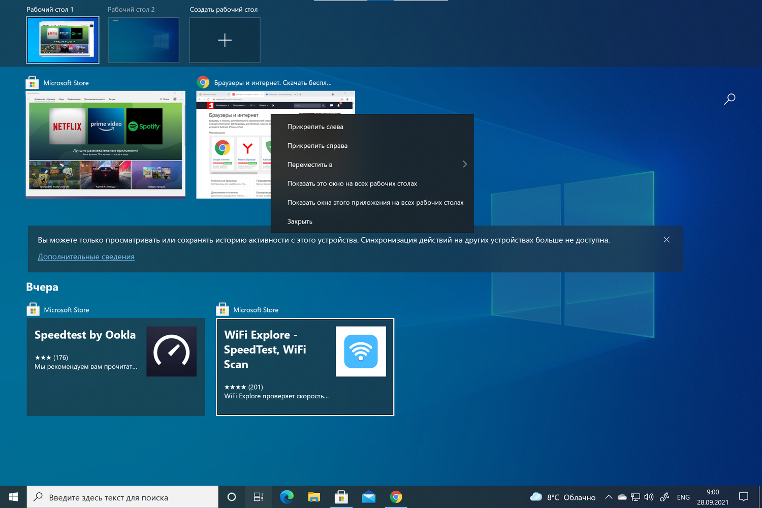 В Windows 11 картина существенно меняется. Microsoft удалила временную шкалу из новой операционной системы. О своем решении компания объявила еще в июне 2021 года. Редмонд обосновал это тем, что существуют более подходящие решения для синхронизации между устройствами, а локальная история активности оказалась не такой полезной, как считалось изначально. Многие пользователи никогда не использовали временную шкалу. Зато теперь в Windows выделен специальный пользовательский интерфейс для управления виртуальными рабочими столами, который намного проще в использовании и на котором легче сосредоточиться. Виртуальные рабочие столы находятся в нижней части экрана, а окна и приложения, открывающиеся на них располагаются в центре.
