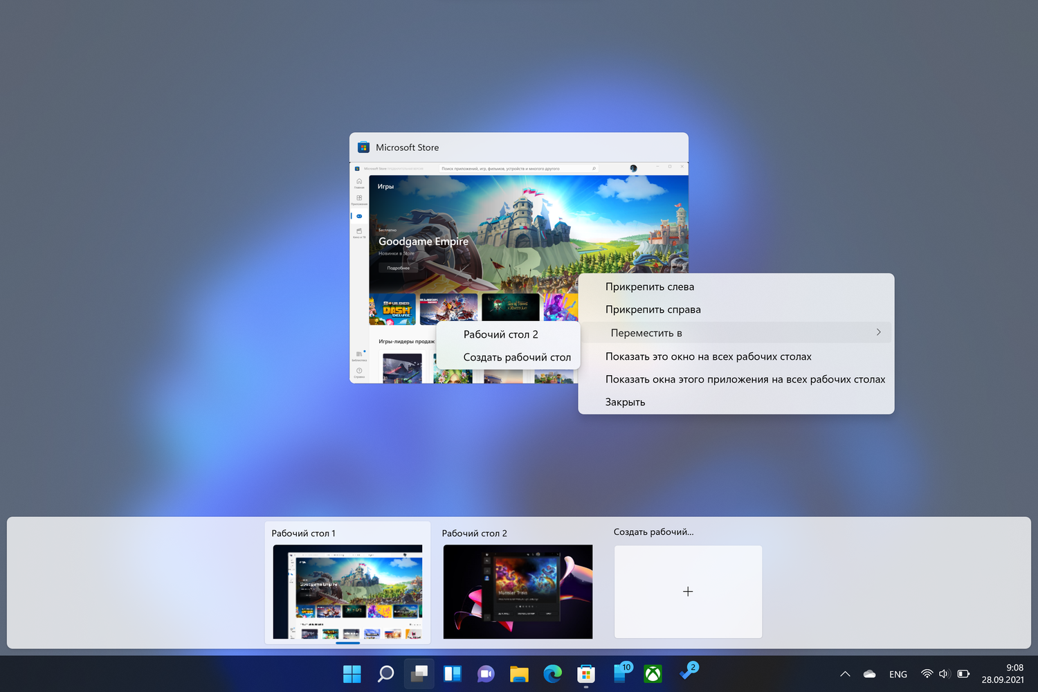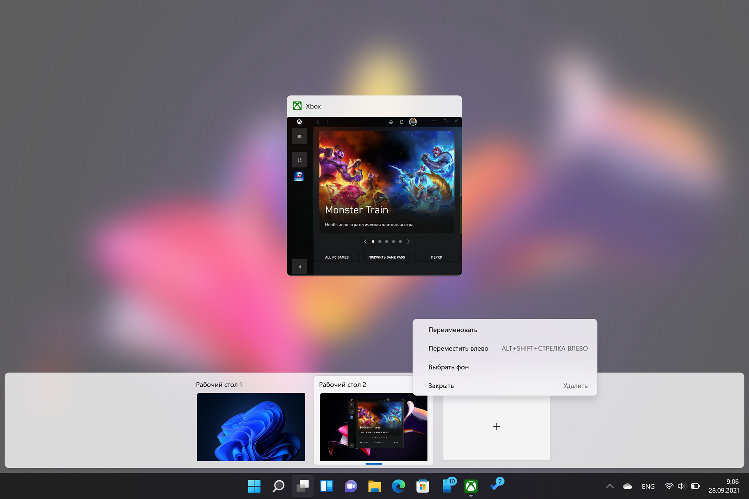 Что касается самих виртуальных рабочих столов, то Microsoft перенесла все возможности из Windows 10 и значительно улучшила их в нескольких областях. Теперь по клику правой кнопкой мыши по виртуальному рабочему столу становятся доступны и другие опции, помимо переименование, а именно перемещение рабочего стола влево или вправо или изменение фона рабочего стола. Изменяя фоновое изображение, вам будет легче различать, какой виртуальный рабочий стол у вас открыт, что является довольно интересной идеей. Вы также можете перетаскивать виртуальные рабочие столы, чтобы менять их порядок — такой возможности просто нет в Windows 10.