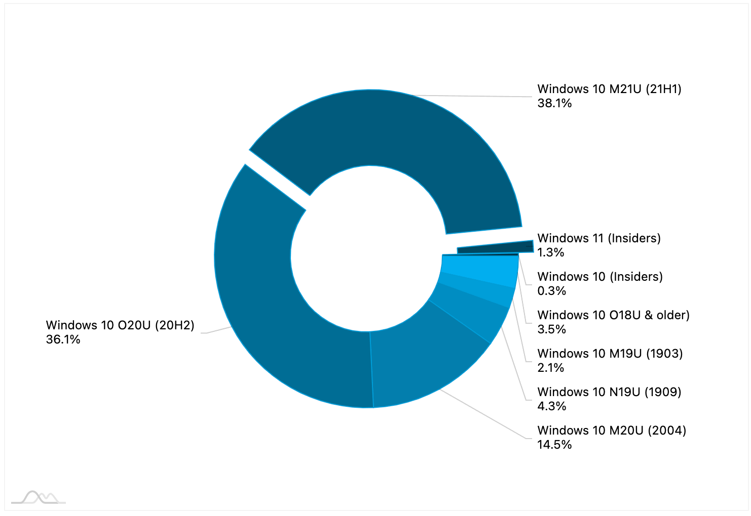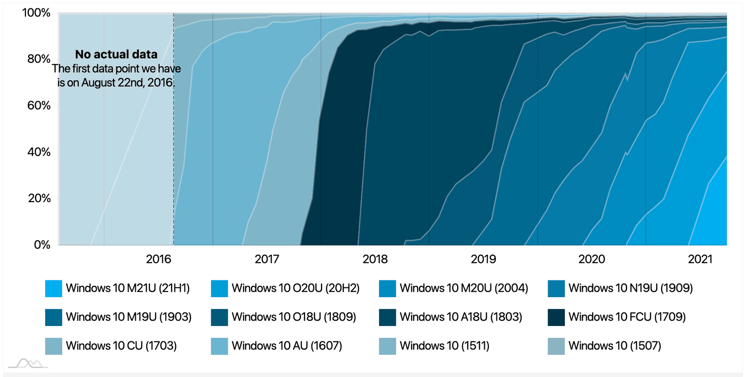 Более старые версии тоже теряют пользователей. Доля версии 1909 снизилась с 5,4% до 4,3%, а версии 1903 — с 2,3% до 2,1%. Версия 1809 и более старшие версии объединены в одну группу с общей долей в 3,5%. Данная цифра на какое-то время должна зафиксироваться, потому что в данную группу входит сразу три выпуска LTSC с долгосрочной поддержкой.
